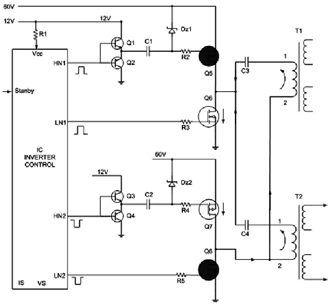 Khi có có lệnh điều khiển từ CPU vào chân Stanby cho phép khối cao áp hoạt động thì IC mới hoạt động, khi IC hoạt động sẽ cho ra các xung điện ở các chân HN1, LN1, HN2 và LN2, thông thường các xung điện HN được khuếch đại đệm qua các cặp đèn BCE thuận ngược để tăng độ ổn định, sau đó ghép qua tụ để sang điều khiển các đèn Mosfet thuận, các tụ C1 và C2 sẽ cho xung điện đi qua và ngăn điện áp một chiều, các đi ốt Zener Dz1 và Dz2 tạo điện áp phân cực cho hai đèn Mosfet thuận có điện áp GS tương đương với điện áp GS của